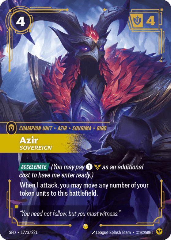 [Accelerate] (You may pay {1}{OR} as an additional cost to have me enter ready.) When I attack, you may move any number of your token units to this battlefield.