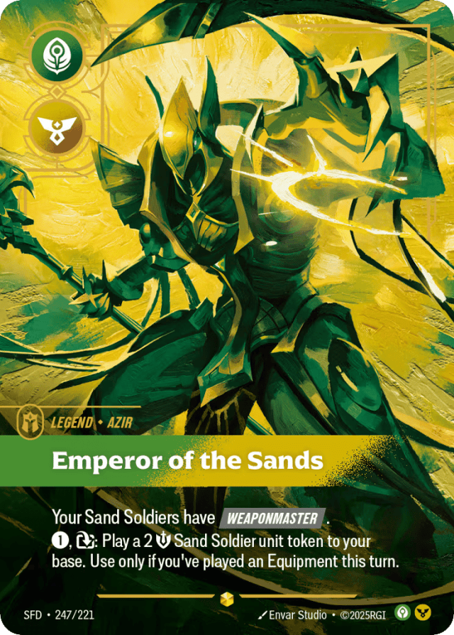Sand Soldiers you play have [Weaponmaster]. (When they're played, you may [Equip] one of your Equipment to them for {RR} less.) {1}, {E}: Play a 2 {M} Sand Soldier unit token to your base. Use only if you've played an Equipment this turn.