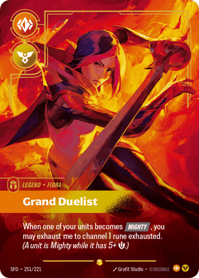 When one of your units becomes [Mighty], you may exhaust me to channel 1 rune exhausted. (A unit is Mighty while it has 5+ {M}.)