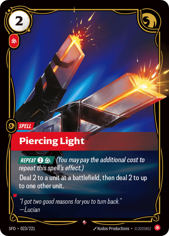 [Repeat] {2}{FR} (You may pay the additional cost to repeat this spell's effect.) Deal 2 to a unit at a battlefield, then deal 2 to up to one other unit.