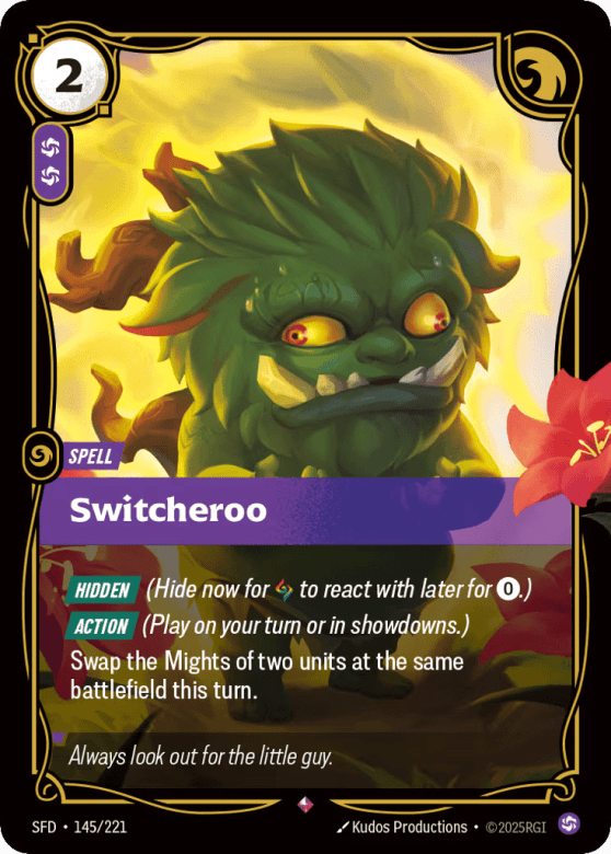 [Hidden] (Hide now for {RR} to react with later for {0}.) [Action] (Play on your turn or in showdowns.) Swap the Might of two units at the same battlefield this turn.